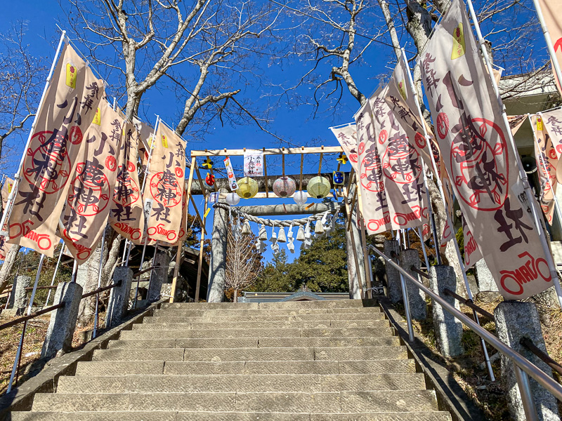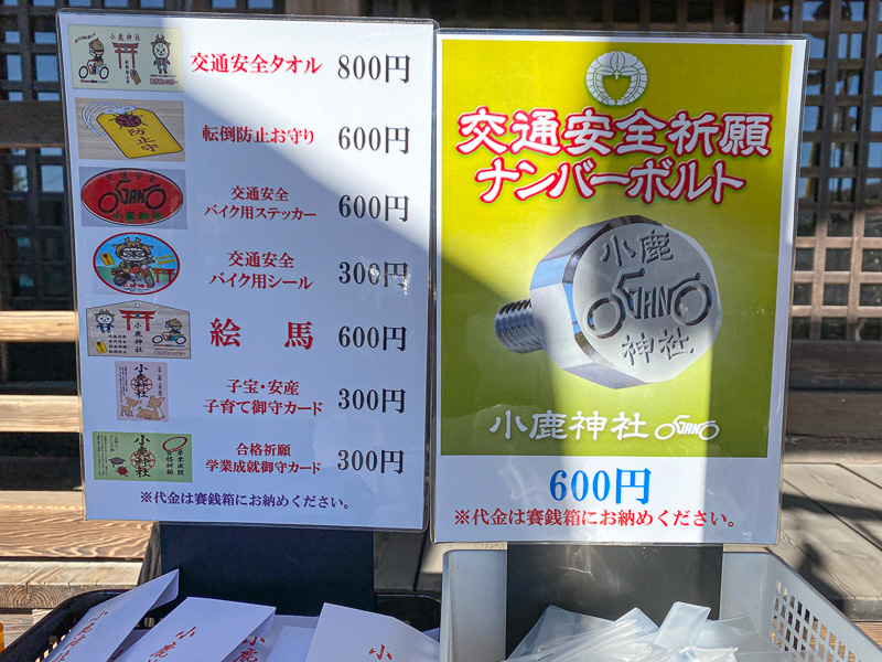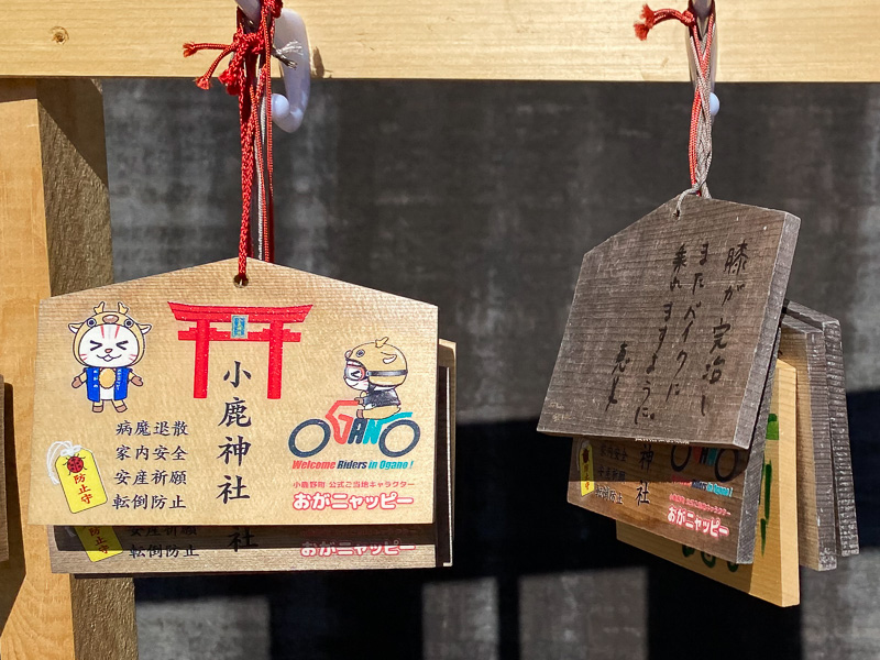 社殿に通じる参道の石段から境内には、小鹿野のアルファベット表記「OGANO」をデフォルメし、オートバイのシルエットをあしらったロゴマークが染め抜かれたのぼり旗が立てられ、「バイクで転倒しない」をもじったテントウムシをあしらった転倒防止お守りなど、バイクの交通安全を祈願する様々なお守りが販売されている。訪れたライダーの多くは参拝の後、社殿脇の社務所に置かれたノートに訪問日と名前、そして愛車の車種をつづり、旅の安全を祈ってゆく。