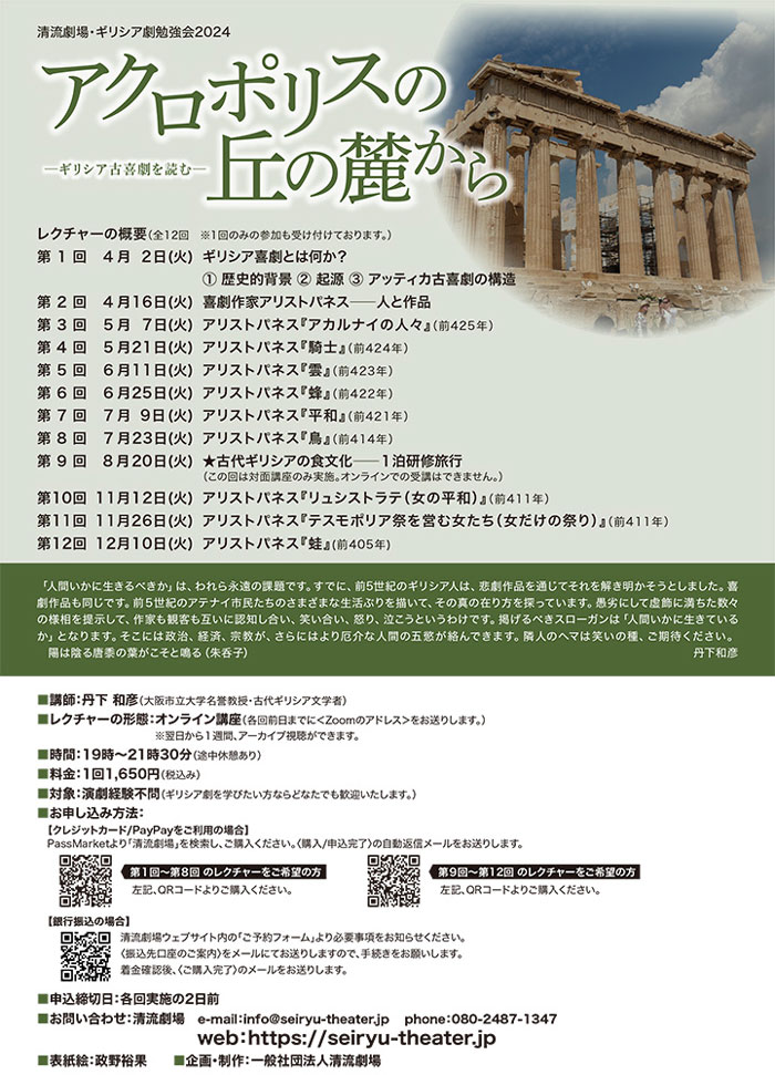 今回の勉強会の開催に際して清流劇場は「時代の風雪に耐え、これまで残ってきた不朽の名作群を紐解きながら、《人間存在をどのようにとらえるか》・《いかにして自らが、より精神的豊かさを携えて、生きるか》をテーマに、ギリシア劇をもっと深く学んでみたいと思い、この勉強会を企画しました。8年目を迎える今年は、ギリシア喜劇を取り上げます。政治家への揶揄・社会風刺などを扱ったこれらの作品を、当時の政治状況や社会問題と照らし合わせながら学んでいきます」とその意図を語っている。